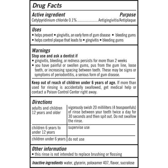 Active Ingredients: Cetylpyridinium Chloride (0.1 %), Antigingivitics/Antiplaque. Inactive Ingredients: Flavor, Glycerin, Poloxamer 407, Sucralose, Water.