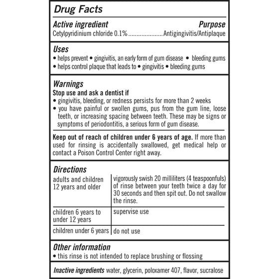 Active Ingredients: Cetylpyridinium Chloride (0.1 %), Antigingivitics/Antiplaque. Inactive Ingredients: Flavor, Glycerin, Poloxamer 407, Sucralose, Water.