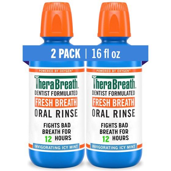 - Two pack 16 fl oz of TheraBreath Fresh Breath Oral Rinse in a Invigorating Icy Mint flavor is a breath freshener mouthwash that’s dentist formulated and alcohol free