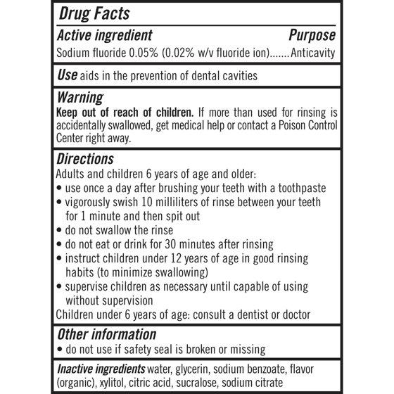 Active Ingredients: Sodium Fluoride (0.02% w/v Fluoride Ion) (0.05 %), Anticavity. Inactive Ingredients: Water, Glycerin, Sodium Benzoate, Flavor (Organic), Xylitol, Citric Acid, Sucralose, Sodium Citrate.