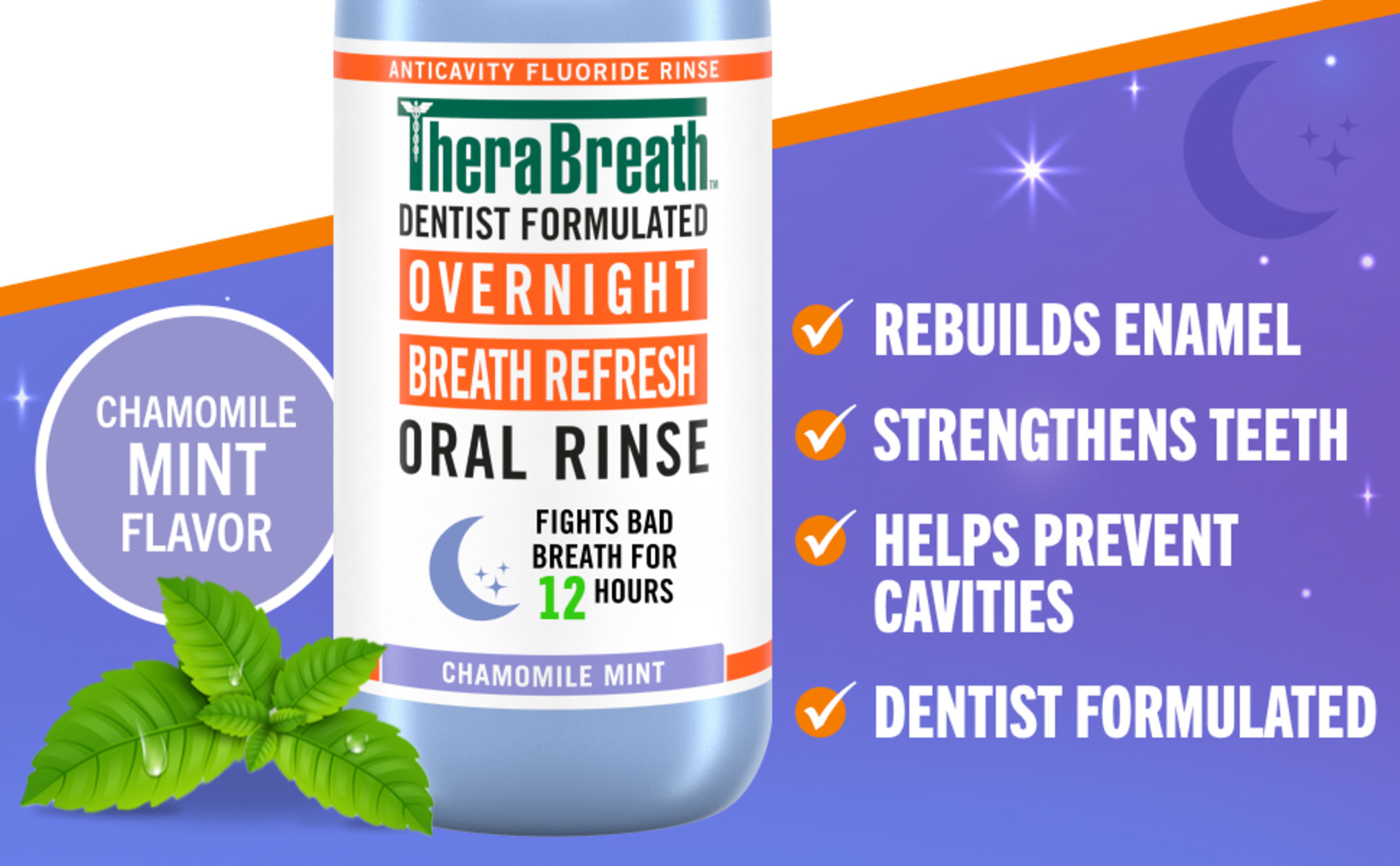 - One 16 fl oz TheraBreath Overnight Mouthwash; Dentist Formulated; Chamomile Mint Flavor; Fluoride Rinse; Alcohol Free