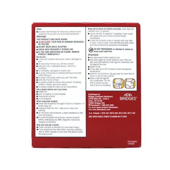 ThermaCare Menstrual heating pads provide soothing, calming heat that relaxes muscular contractions for effective menstrual cramps pain relief. ThermaCare Heat Wraps for menstrual pain relief send real heat deep into your muscles to relax contractions and relieve period cramps for up to 8 hours. The heat patches attach to the inside of your underwear and are thin and discreet enough to wear under clothing, on the go and while relaxing. To use these thermal pads, first peel away paper to reveal adhesive side. Next, place heat wrap on the pain area with adhesive side against underwear and not against the skin. Then, make any needed adjustments and firmly rub over the adhesive to lock in place. These calming heat pads will then start working to relieve painful menstrual cramps. It may take up to 30 minutes for the heat patches to reach therapeutic temperature. Read the full product labeling for complete usage instructions. Provides soothing, calming heat for up to 8 hours for menstrual cramps pain relief Thin enough to wear discreetly under clothing Menstrual heating pads can be worn on the move, during chores, or when relaxing Also works for back pain relief To use a heating pad for menstrual cramps, first, peel away paper to reveal adhesive side Place heat patch on pain area against underwear Firmly rub over the adhesive to lock in place and begin cramp relief