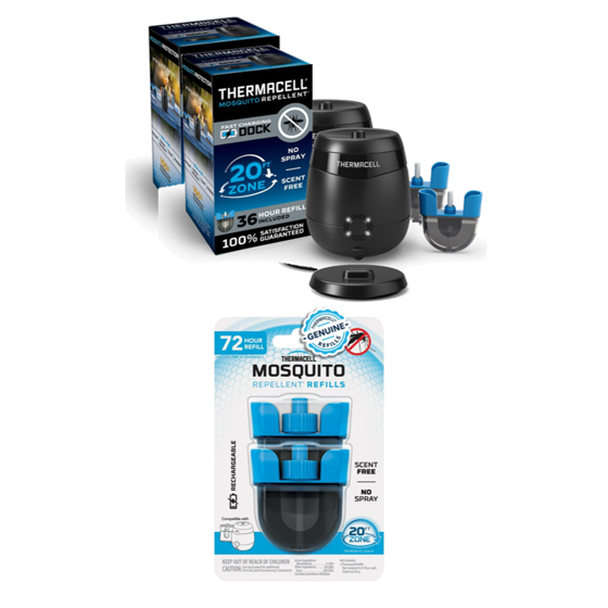 - Pack includes 2 repellers, 108 hours of Thermacell mosquito repellent refill, USB-C charging cable, and fast-charging dock