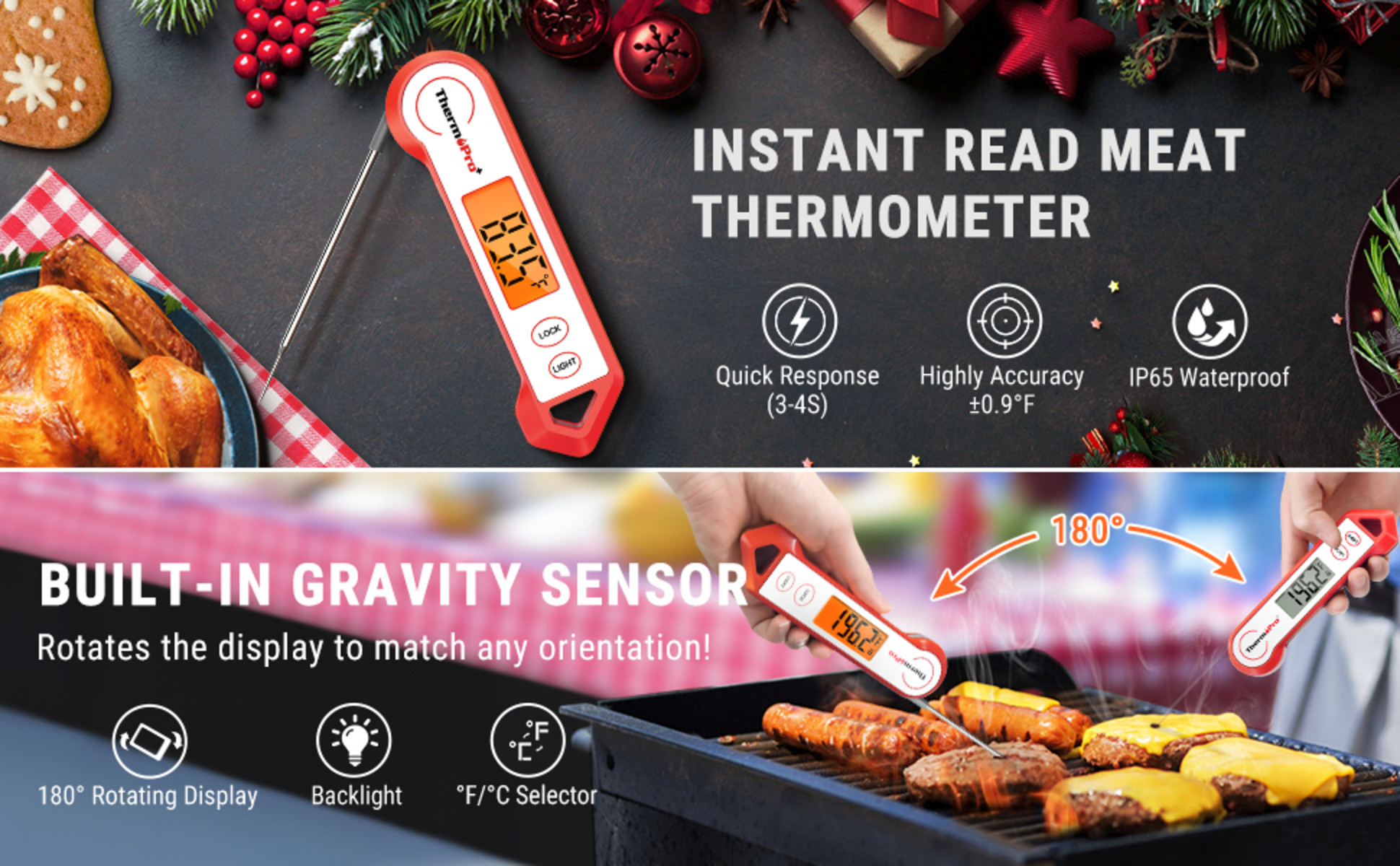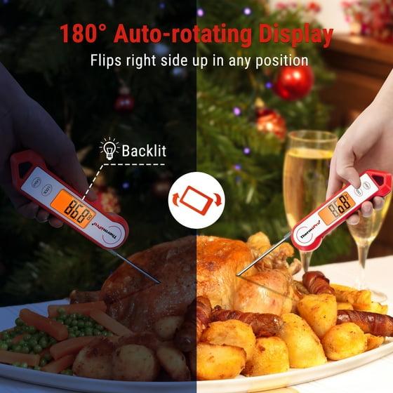 - Grilling thermometer with 180 degrees rotating display making it easy to use with either hand or awkward angles. No more struggle in tight or dim spaces when checking on your food