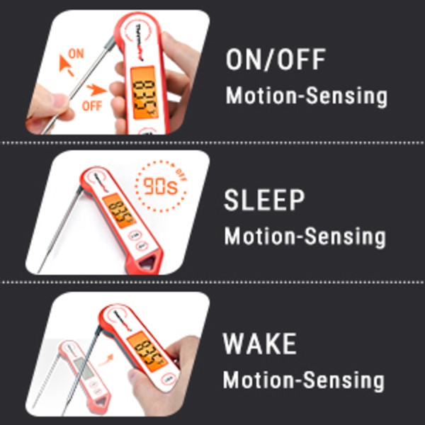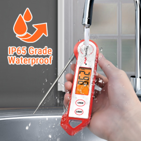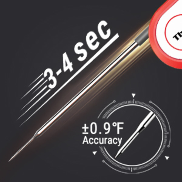 - Instant read thermometer with backlight features a precise food grade stainless steel probe. It achieves a temp reading within only 2-3 seconds by using a high quality thermocouple sensor. And only weighs 2 ounces.