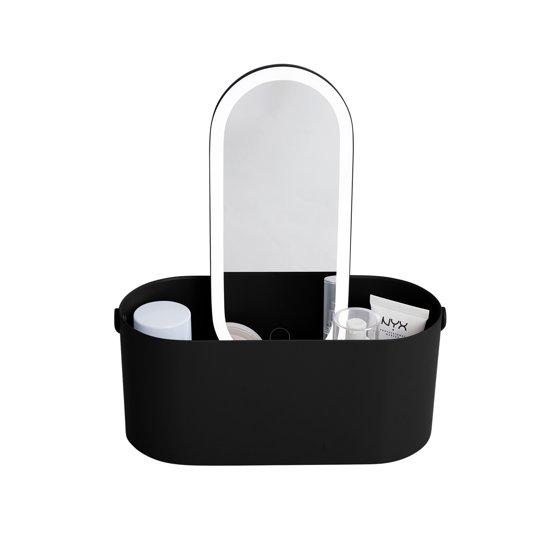 Thinkspace Beauty Storage Organizer with Mirror. This LED mirror can hold all of your beauty essentials and has a handle for portability. Get ready anywhere you need to. The mirror clips onto the base so you can access your makeup and tools and use the LED mirror at the same time. Great for travel. Built-in handle for easy transportation.