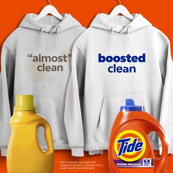 - WHAT’S INCLUDED: Includes one 80 fl oz jug of Tide Laundry Detergent Liquid with 6X Boosted Cleaning Power in the Spring Meadow scent, good for 64 loads