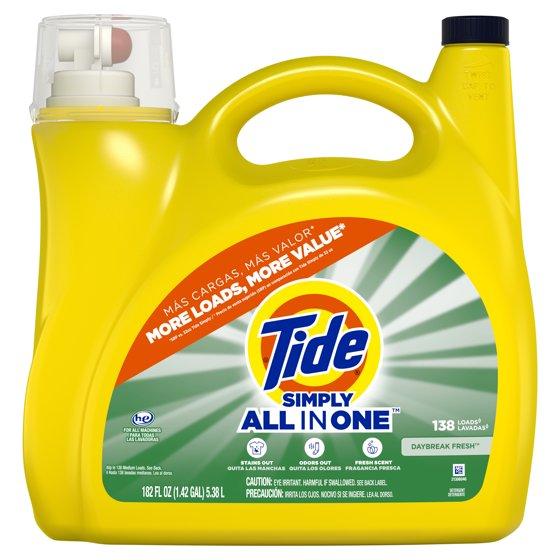 - Includes one 182 fl oz jug of Tide Simply All-In-One Liquid Laundry Detergent in the Daybreak Fresh Scent, good for 138 loads