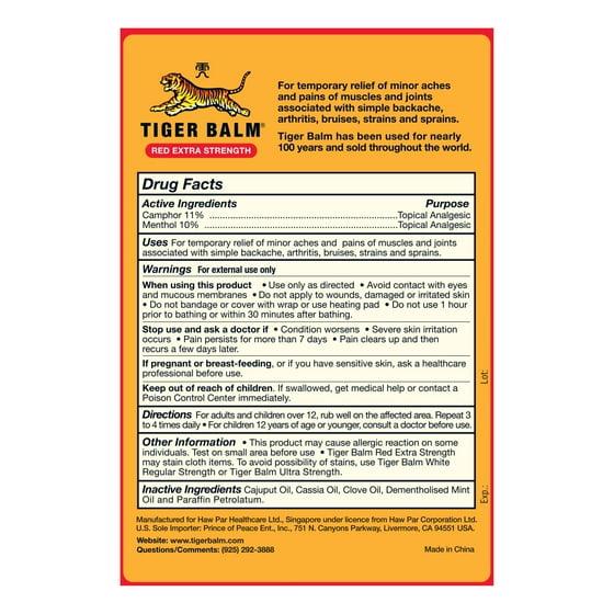 Tiger Balm Extra Strength Pain Relieving Ointment, in a 0.63 oz jar, provides effective relief for arthritis, joint pain. Its powerful blend of herbal ingredients, including cassia oil (cinnamon), delivers a comforting warmth that alleviates pain and soreness effectively. The ointment is paraben free. The ointment's distinctive reddish color and soothing aroma have established it as a trusted choice for generations seeking relief from arthritis and joint discomfort. Whether you're managing acute or chronic pain, Tiger Balm Extra Strength Ointment offers a safe and reliable solution for long-lasting pain relief. Experience the enduring benefits of Tiger Balm Extra Strength Ointment and regain comfort in your daily activities.