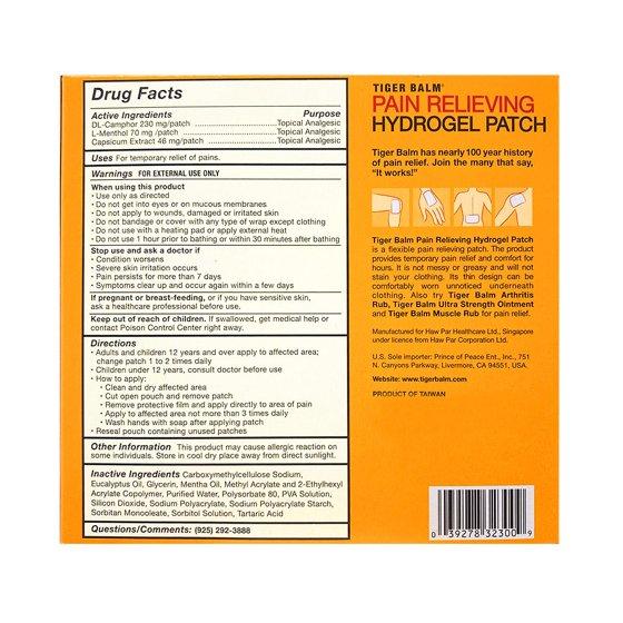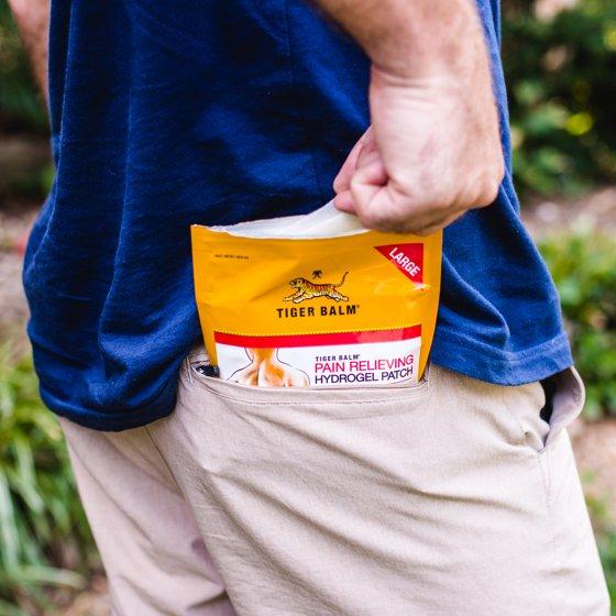 Tiger Balm Hydrogel Pain Relieving Patch, 4 ct, with Camphor, Menthol and Capsicum offers effective relief for backaches, strains, sore muscles, sprains, lumbar discomfort, or fatigue after a long day. Whether you're recovering from intense workouts, dealing with postural discomfort, or experiencing pain from everyday activities like texting or gaming, our patches are designed to recharge and revitalize your muscles. Ideal for large body areas in need of relief, these patches combine Tiger Balm's herbal blend with a clean, easy-to-use patch format. These long lasting patches are easy to apply and remove without sticky residue, and are paraben free. They provide strong, targeted relief without the mess or greasiness of traditional ointments, ensuring they won't stain clothing. The ventilated hydrogel adheres comfortably to your body, delivering hours of soothing comfort and relief.