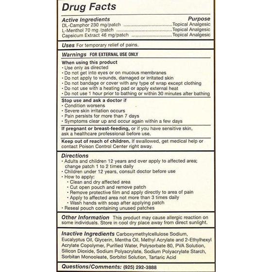 Drug Facts Active Ingredients Purpose Camphor 230 mg/patch Topical analgesic Menthol 70 mg/patch Topical analgesic Inactive Ingredients: Capsicum Extract, Eucalyptus Oil, Glycerin Mentha Oil, Polyacrylic Acid, Polysorbate 80, Sodium Carboxymethylcellulose, Sodium Polyacrylate, Sodium Monooleate, Sorbitol, Tartaric Acid, Water