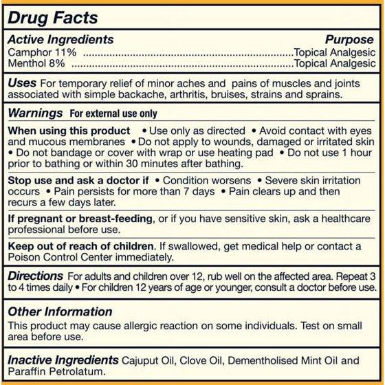 Active Ingredients: Camphor 11%, Menthol 8% Inactive Ingredients: Cajuput Oil, Clove Oil, Dementholised Mint Oil and Paraffin Petrolatum