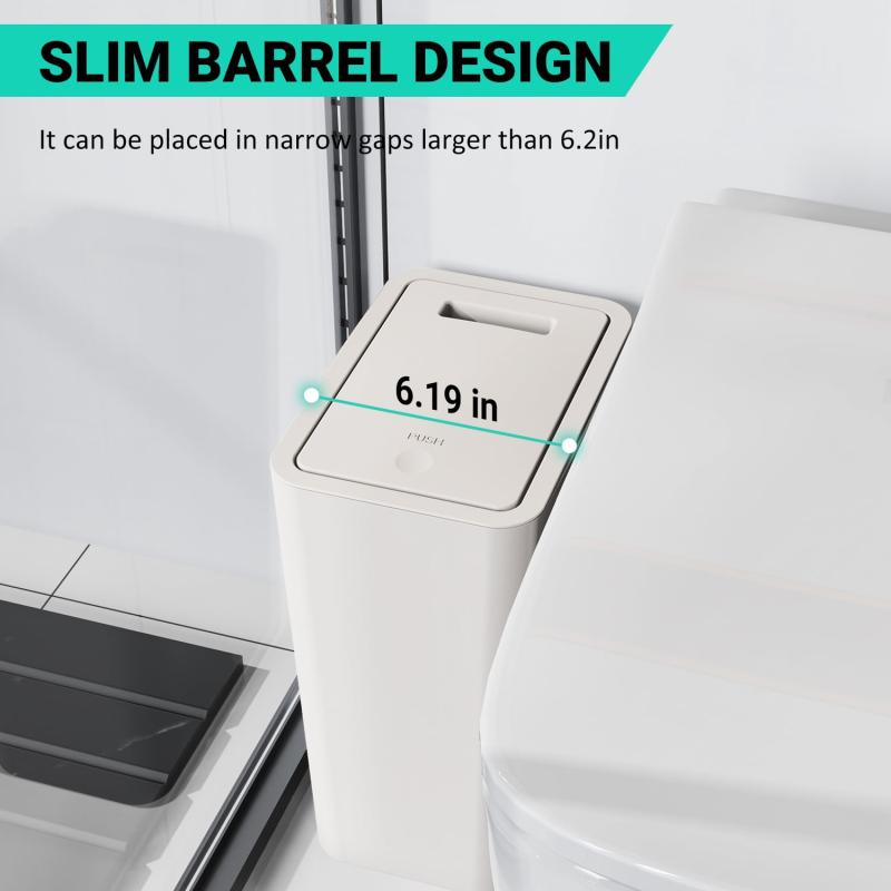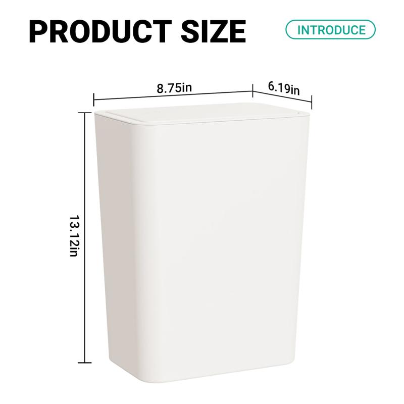 Space-Saving Design:Designed to maximize tight spaces, these bathroom trash cans are perfect for compact kitchens, bedrooms, and bathrooms. With dimensions of 8.75" (L) x 6.19" (D) x 13.12" (H) and a 2.6 Gallon/10 Liter capacity, they're tailored for small areas.