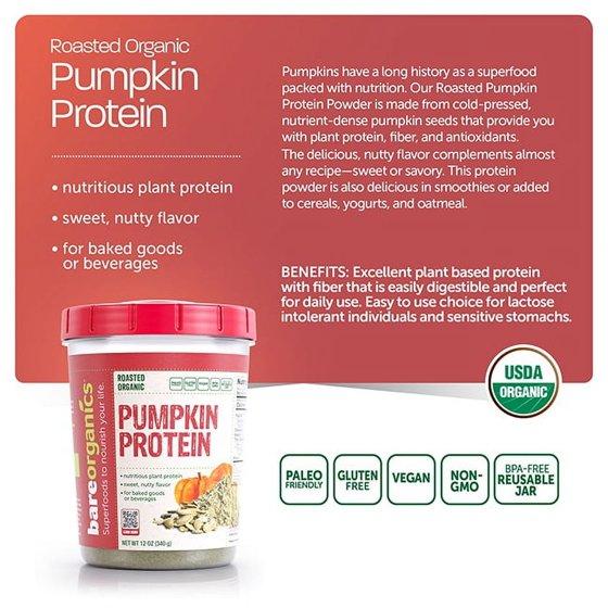 - BareOrganics Organic Pumpkin Protein Powder is packed with easily digestible organic plant protein, fiber and antioxidants including natural phytosterols, historically known to potentially help reduce levels of bad cholesterol. Made from the nutrient-rich seeds of pumpkin, a popular superfood, BareOrganics Organic, Roasted Pumpkin Protein Powder is packed with natural plant protein, fiber, and antioxidants. An outstanding energy booster that can be enjoyed by just about everyone—including people with gluten, lactose or casein intolerances. Super-easy to use, it brings an enticing, sweet, nutty flavor to your favorite foods and drinks.