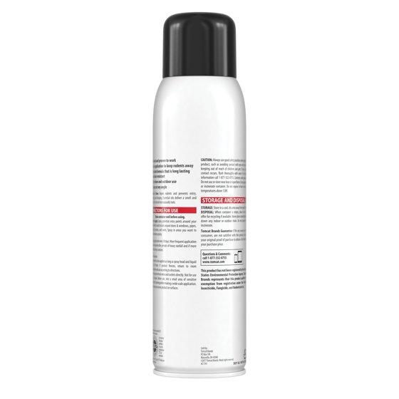- Inside & outside rodent prevention. Safe for use around kids & pets (when used as directed). Long lasting & rain resistant formula. Keep mice & rats out! Covers approximately 275 sq. ft. Tested and proven to work. Easy application to keep rodents away. No stink formula that is long lasting and rain resistant. For indoor and outdoor use. Spray at any angle. What It Does: Repels rodents and prevents entry, nesting and foraging. Essential oils deliver a smell taste that rats and mice naturally hate. 100% money back guarantee. TomCat Brands Guarantee: If for any reason you, the consumer, are not satisfied with this product, mail us your original proof of purchase to obtain a full refund of your purchase price. This product has not been registered by the United States Environmental Protection Agency. Tomcat Brands represents that this product qualifies for exemption from registration under the Federal Insecticide, Fungicide, and Rodenticide Act. www.tomcat.com. Questions & Comments: Call 1-877-332-0755. www.tomcat.com. No CFCs - Contains no CFCs which deplete the ozone layer. Federal regulations prohibit CFC propellants in aerosols.
