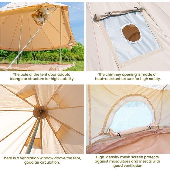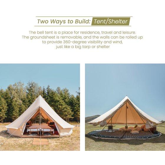 - 【Great Visibility】The bell tent is a place for residence, travel and leisure. The groundsheet is removable, and the walls can be rolled up to provide 360-degree visibility and wind, just like a big tarp. You can enjoy the breeze in the summer sun. Enjoy the beautiful scenery and fresh air. The tent is waterproof and windproof, can be used for garden, meadow, forest family. Suitable for summer and winter camping, glamping, park and festival events.