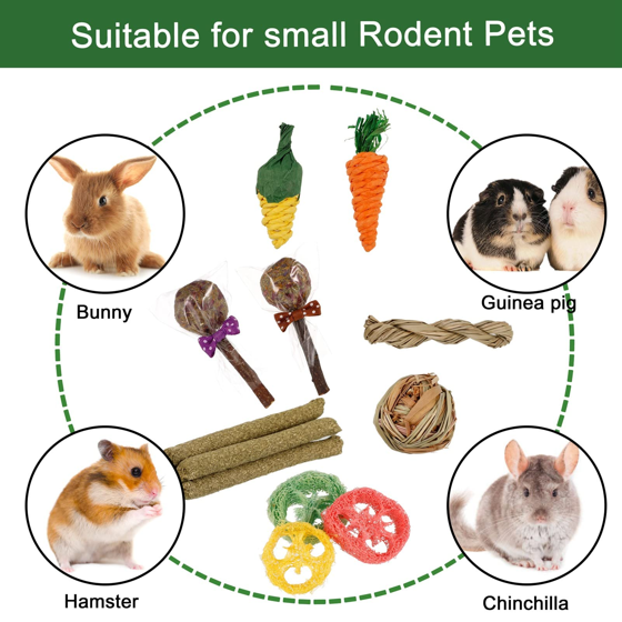 - 【Suitable for most small animals】: Chew toy set for rabbits, guinea pigs, chinchillas, hamsters, gerbils, rats, degus, squirrels, lop rabbits, prairie dogs and other small animals.