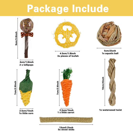 - 【Package includes】: You get 5 Rabbit Natural Hay Sticks, 3 Loofah Toys, 1 Water Grass Ball, 1 Water Grass Twist, 1 Carrot, 1 Corn, 2 Tree Sticks and Marigold, Forget Me Not, Rose Mix Sticks lollipop.