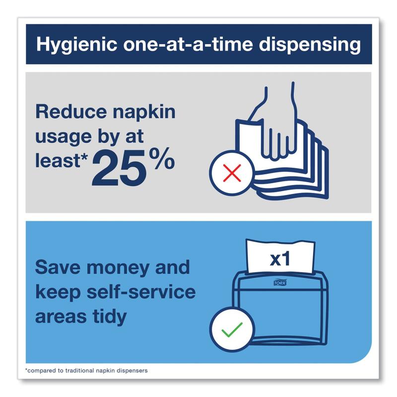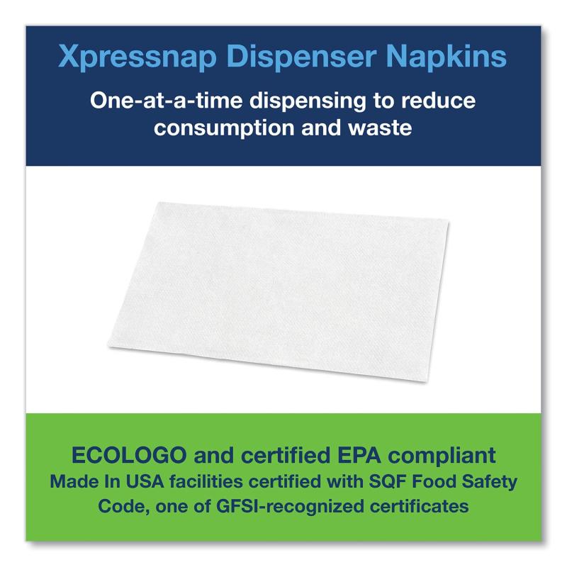 Impress your restaurant patrons with the exceptional quality of Tork Xpressnap Interfold Dispenser Napkins. The one-at-a-time napkin dispensing design ensures that patrons use fewer napkins and touch only the napkin they are going to use, improving personnel hygiene. Plus, one-at-a-time dispensing helps decrease consumption, so you'll reduce the number of cases you need to store. Xpressnap napkins are larger than major competitor interfolded napkins offering strength, absorbency and quality to users. Smaller case size offers storage savings of up to 50%. Inner bag packaging protects and ensures the quality of unused napkins while in storage. Includes 12 packs of 500 napkins. Contains 20% post-consumer recycled content, 100% total recycled content. EcoLogo Certified.