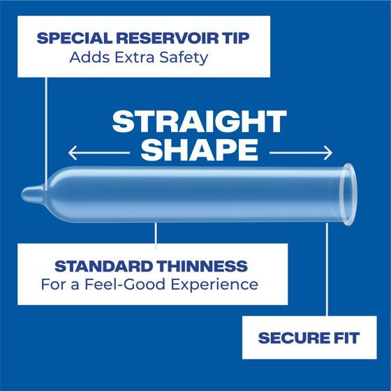- Classic latex condoms with a straight-walled shape for a secure, snug fit to prevent slipping, offering a comfortable experience for all