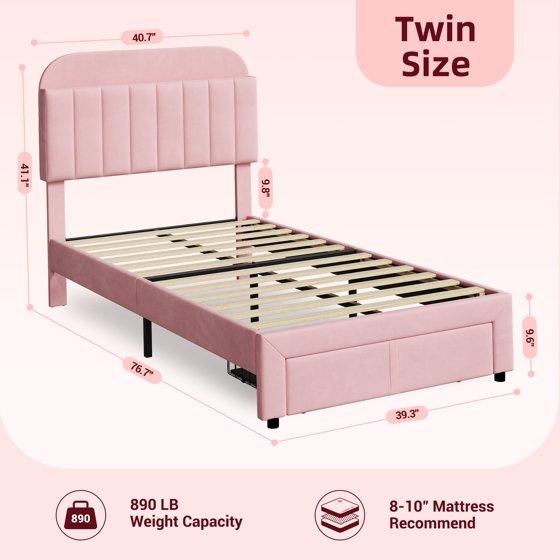 The TROPOW Twin Bed Frame is the ideal choice for parents looking to combine functionality, comfort, and style in their child's bedroom. This bed frame features a soft velvet upholstered headboard, which is not only comfortable for bedtime stories and relaxation but also includes a bookcase headboard with two open storage cubbies for books, toys, and other essentials. Additionally, the under-bed storage drawer offers generous space to store clothes, toys, or extra bedding, keeping your child's room organized and tidy.
