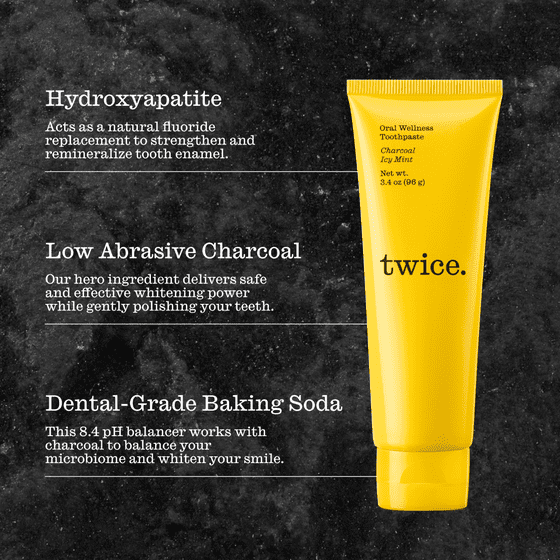 Smile Twice award-winning fluoride-free hydroxyapatite Oral Wellness Toothpaste is truly all-in-one. Smile Twice fluoride-free toothpaste includes activated charcoal and baking soda to naturally whiten and polish even the most sensitive teeth, hydroxyapatite to remineralize enamel, and vitamin enriched to improve the wellness of your mouth. For protection and enamel health, hydroxyapatite helps strengthen and remineralize enamel. The blend of antioxidant vitamins help improve the wellness of your mouth with a 8.4 pH* balanced formula keeping your oral microbiome in harmony *approximate. While supporting healthier gums with Vitamin A, Vitamin C, and Vitamin E. Smile Twice toothpaste is packed with plant-based, natural, organic, and science-derived ingredients. Along with being Vegan and Cruelty Free (Leaping Bunny Certified), Sulfate and SLS Free, Gluten Free, Paraben Free, Artificial Dye Free, BPA Free, and 100% Recyclable.
