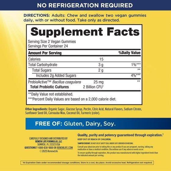 Renew Life Non GMO Gummy Probiotic for Digestive Health, Raspberry, Renew Life Extra Care Digestive probiotic gummies for adults is formulated with prebiotics and probiotics for 2-in-1 digestive health support. These delicious Raspberry Flavor probiotic gummies for women and men are made with clinically studied, multiple diverse strains to support an adult's digestive and immune health, with probiotic strains tough enough to survive stomach acid. Each serving provides 2 billion live probiotic cultures from 2 probiotic strains. 70% of your immune system lives in your gut, Renew Life Extra Care Digestive probiotics are formulated to support immune health in men and women. This vegan probiotic is Non-GMO Project Verified; gluten, dairy, and soy free, and no refrigeration is required. Multiple diverse strains, clinically tested probiotic strains, potency guaranteed through expiration. These statements have not been evaluated by the Food and Drug Administration. This product is not intended to diagnose, treat, cure, or prevent any disease.