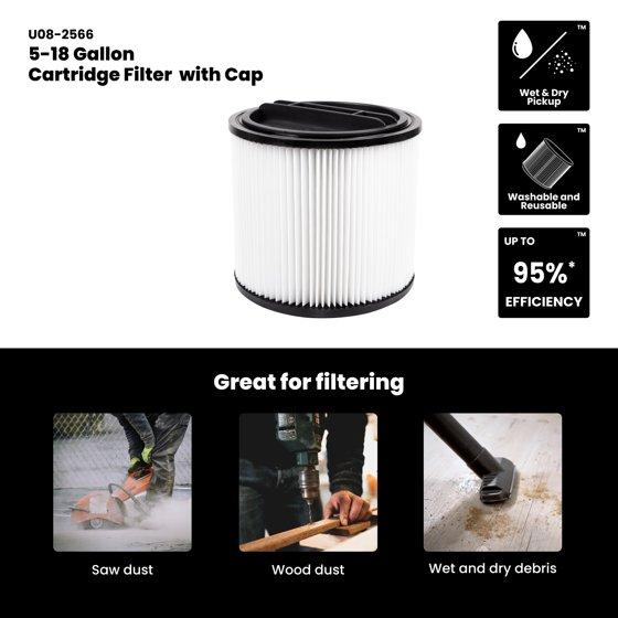Universal Standard Dust Cartridge Filter with Cap, Fits most 5-18 Gallon Wet/Dry Vacuums