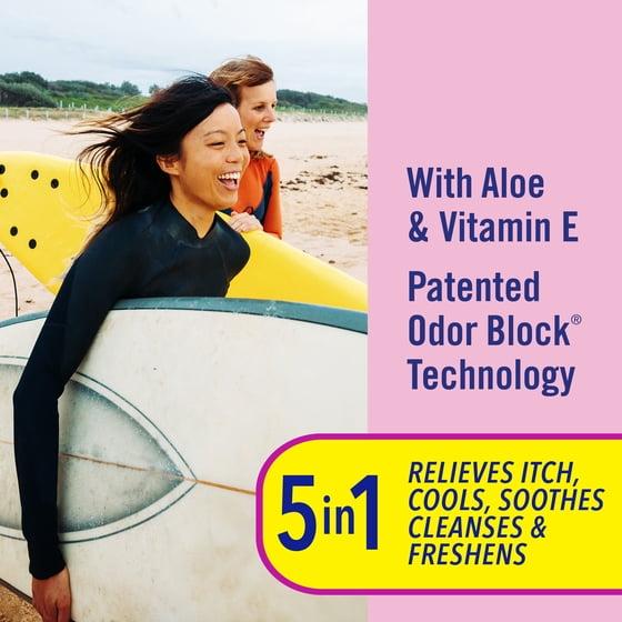 - Contains patented Odor Block Technology to stop odor and Aloe and Vitamin E to soothe intimate skin. Helps reduce further irritation.