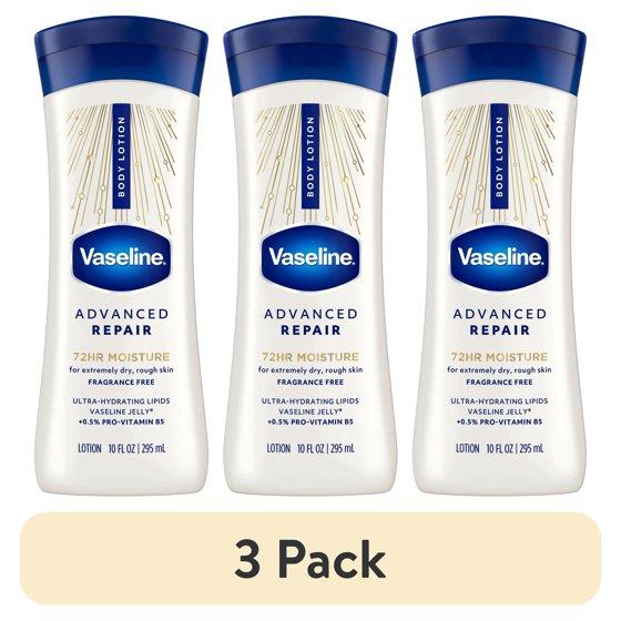 (3 pack) Vaseline Intensive Care Body Lotion for Dry Skin Advanced Repair Unscented Lotion Made with Ultra-Hydrating Lipids + Vaseline Jelly to Repair Extremely Dry Skin 10 fl oz