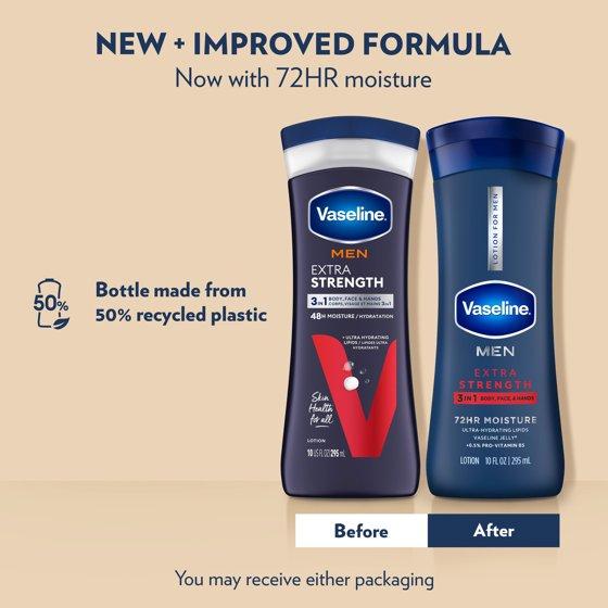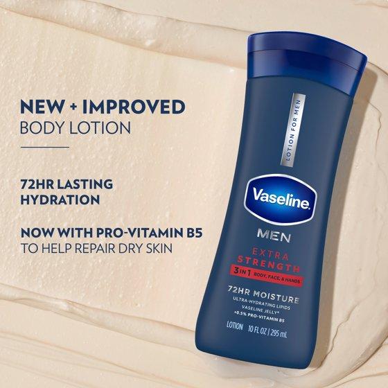 - DEEP MOISTURIZATION: Vaseline® Men Extra Strength 3-in-1 Face, Hands & Body Lotion For Men moisturizes deeply and helps heal dry skin, giving you healthy-looking, resilient skin