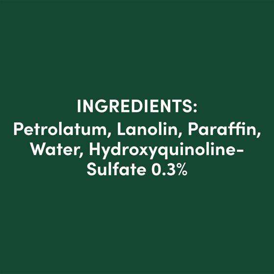 Four simple ingredients are uniquely combined to create a mighty skin salve with no added colors or fragrances: Petrolatum moisturizes. Lanolin soothes and softens. 8-Hydroxyquinoline Sulfate preservative. Paraffin wax helps bind the ingredients together.