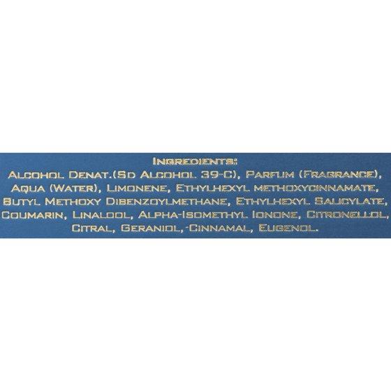 Alcohol Denat., (Sd Alcohol 39 C), Parfum (Fragrance), Aqua (Water), Limonene, Ethylhexyl Methoxycinnamate, Butyl Methoxy Dibenzoylimethane, Ethylhexyl Salicylate, Coumarin, Linalool, Alpha-Isomethyl Ionone, Citronellol, Citral, Geraniol, Cinnamal, Eugenol.