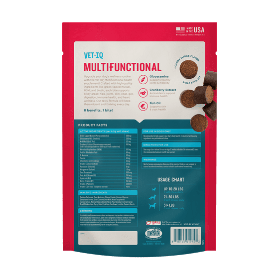 - Made with a careful selection of high-quality ingredients, our Multifunctional soft chews include glucosamine to support healthy joints and mobility, cranberry extract for their immune system, and fish oil for healthy skin and a shiny coat