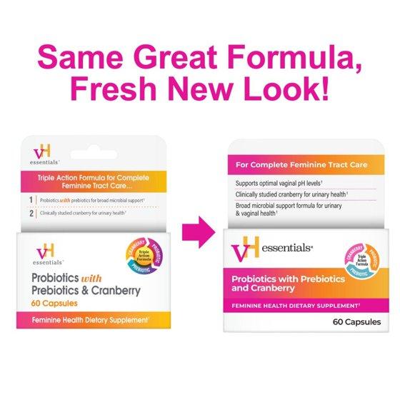- RENEW FRESHNESS: vH Essentials Probiotics with Prebiotics and Cranberry Capsules help restore your wellbeing and confidence. Good-bye odor! Hello, a refreshed you!