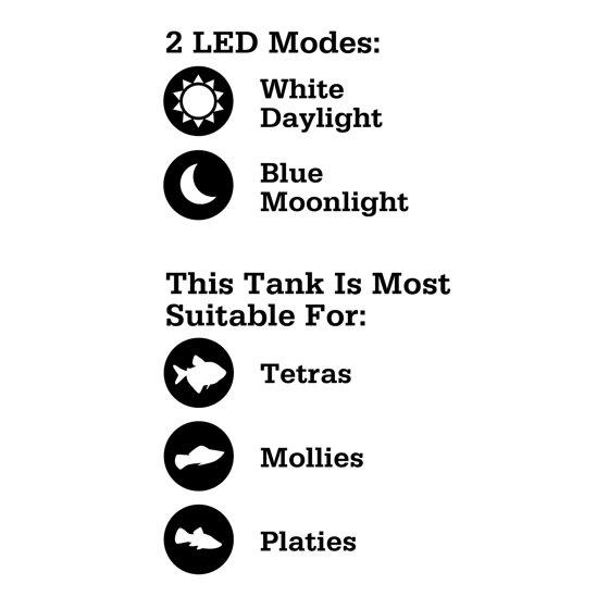 The Vibrant Life 10-Gallon Glass Aquarium Starter Kit is the perfect way to begin your home aquarium adventure, offering everything you need in one convenient package. This kit includes a scratch-resistant glass tank and energy-efficient LED lighting with two adjustable modes: White Daylight and Blue Moonlight - designed to enhance your aquarium’s ambiance. The hood helps minimize water evaporation and features a handy feeding hole for daily care. Equipped with a Vibrant Life Medium Power Filter boasting a 75 GPH motor and a multi-stage Medium Filter Cartridge, this setup keeps your water clean and your fish happy. Measuring 20.13" L x 10.19" W x 12.19" H, this tank is best suited for small fish such as tetras, mollies, and platies, with a recommended stocking level of up to 10 inches of fish. Always avoid overcrowding and ensure compatibility when selecting multiple species. This all-in-one Vibrant Life 10-Gallon Glass Aquarium Starter Kit includes the essential equipment you need to begin your home aquarium journey.