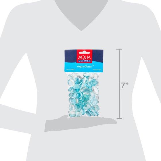 Add a touch of color to your fish tank set up with these Vibrant Life Aqua Gems. This standard multicolor mix features light blue and clear glass gems. They are a colorful alternative to aquarium gravel and are made with 100 percent glass, providing stylish flare and durability that you can count on. These decorative glass gems have a smooth texture and are safe to use in either saltwater or freshwater, making them a versatile addition to any aquarium. All they need is a good rinse before you introduce them to your fishes' habitat. Available in a 14-ounce bag, you'll be able to pick up plenty of these decorative gems to fill up your tank with a soft blend of colors. Whether these are a gift for a friend or a new addition to your home or office aquarium, these Aqua Culture Aqua Gems bring a delightful look to your fish tank.