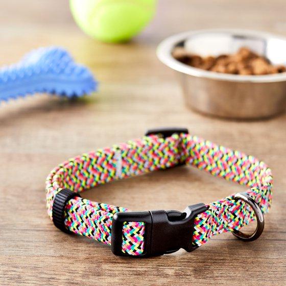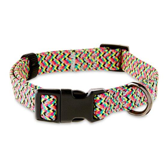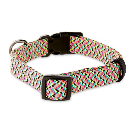 Our Vibrant Life Chevron Reflective Adjustable Dog Collar is a comfortable and stylish everyday collar for your dog. The collar features a trendy multi color chevron pattern that will have your dog strutting down the block in style. It comes equipped with a metal D-ring for easy leash attachment and a sturdy, adjustable plastic buckle for a secure fit. This reflective collar is a size medium and is ideal for dogs comparable to Beagles or Poodles with a neck size between 14 and 20 inches. The reflective material makes sure your pup is easy to spot in dark and low lighting, so they can stay safe. Style your dog in the Vibrant Life Chevron Reflective Adjustable Dog Collar today!
