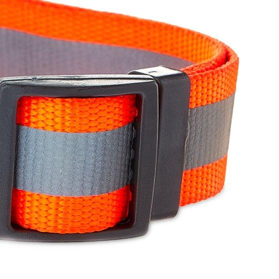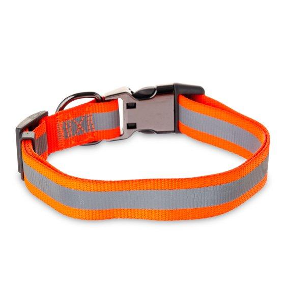 Vibrant Life Nylon Fashion Dog Collar, Orange, L. With a Vibrant Life Metal Clasp Hunter Dog Collar in your dog's inventory of accessories, your dog will be ready to take on their role as the perfect partner when hunting season rolls around. This collar features a vibrant orange color all around for optimal visibility in the woods and has sleek metal clasps with side releases for easy removal. Available in this large size, the collar is ideal for dogs comparable to a boxer or a Labrador with a neck size between 16 and 26 inches. The included D-ring offers a spot to attach your leash as well as a place to put information tags, vaccination IDs and all the other necessary tags your dog needs to showcase what you might want someone to know about them for when they take off running to your neighbors as they pass by or ask for pats from a stranger. Get your dog ready to bring home some game with this Vibrant Life Metal Clasp Hunter Dog Collar.