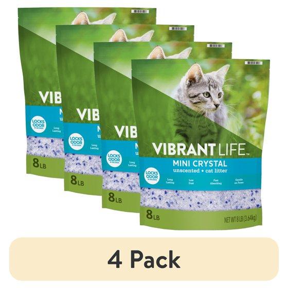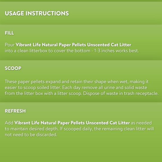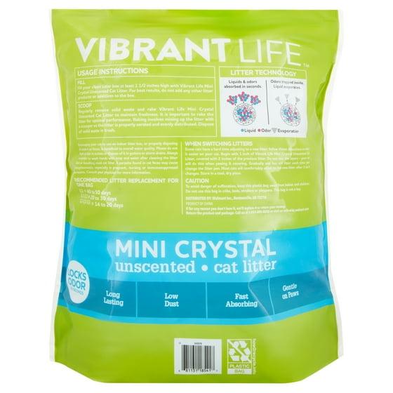 Usage Instructions **Fill **Fill your clean litter box at least 1 1/2 inches high with Vibrant Life Mini Crystal Unscented Cat Litter. For best results, do not add any other litter products or additives to the box. **Scoop **Regularly remove solid waste and rake Vibrant Life Mini Crystal Unscented Cat Litter to maintain freshness. It is important to rake the litter for optimal performance. Raking involves mixing up the litter with a scooper so the litter is properly aerated and evenly distributed. Dispose of solid waste in trash. **Encouraging your cat to use an indoor litter box, or properly disposing of outdoor cat feces, is beneficial to overall water quality. Please do not flush cat litter in toilets or dispose of it outdoors in gutters or storm drains. **Recommended litter replacement for one bag **1 cat = 40 to 50 days **2 cats = 20 to 30 days **3 cats = 14 to 20 days **CAUTION **To avoid danger of suffocation, keep this plastic bag away from babies and children. Do not use this bag in cribs, beds, strollers or playpens. This bag is not a toy.