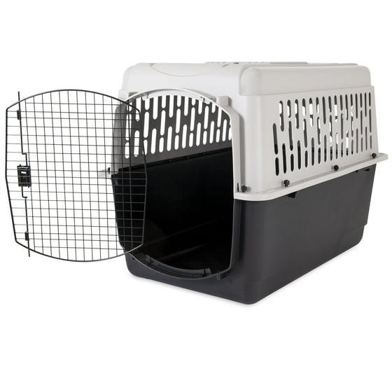 Vibrant Life Plastic Pet Kennel for Dogs Hard-Sided, Large 40 in, Pet Carrier for Pets 70-90 lbs - Give your furry friend a comfy, safe, and secure home with the Vibrant Life Large Hard-Sided Pet Kennel for Dogs. A Vibrant Life Pet Kennel can be a comforting den for your pet, used for housebreaking and travel, and is also beneficial for vet visits. The kennel is easy to assemble, with instruction guide included. It incorporates overlapping beltways and door-pull barriers, to be secured with included bolt and wingnut fasteners for enhanced strength. The Vibrant Life Pet Kennel has sturdy and durable construction, made of heavy-duty plastic and steel wire. The wire door features easy-squeeze latches and keeps your pet safe inside. Your pet will have visibility on all sides and ventilation for flow of fresh air. Available in a variety of sizes to accommodate most dogs, cats, or other pets. Comes with a gray top, black base, and black metal door. The Vibrant Life Large Pet Kennel is ideal for pets 70-90 pounds. Give your pet a safe place to settle down with the Vibrant Life Large Hard-Sided Pet Kennel for Dogs.