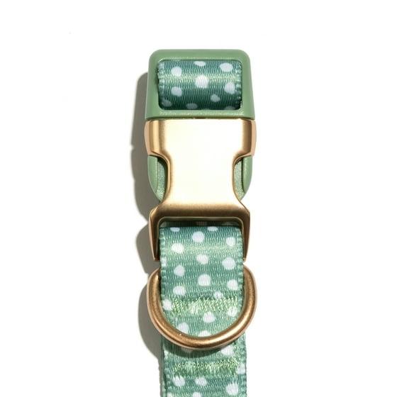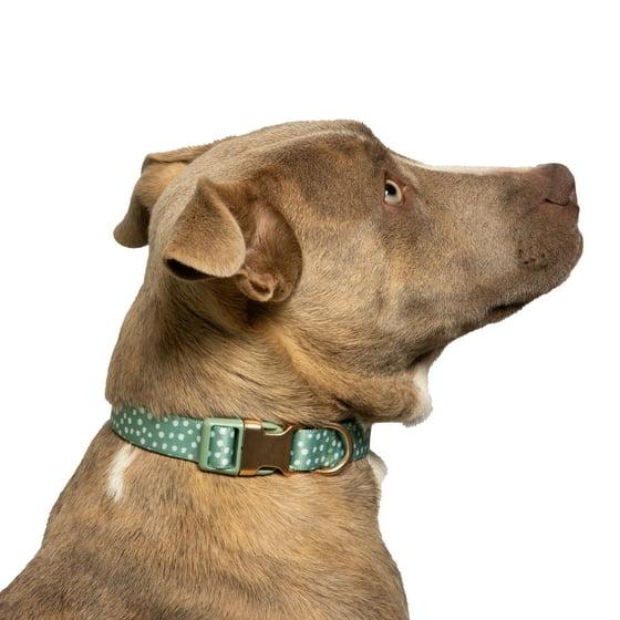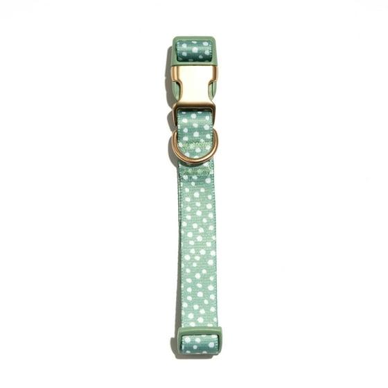 - Our stylish green collar features high-quality webbing with a green and white dot print