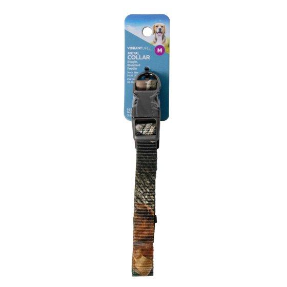 The Vibrant Life Strategy Graph X Camo Dog Collar with Metal Clasp is perfect for your furry hunting companion! This collar features a camouflage design, D-ring, and sturdy, metal buckle that allows for a comfortable and convenient fit. This collar is a size medium and is ideal for dogs with a neck size between 10 to 16 inches. Check out other Vibrant Life animal accessories to complete your dog's look. Make sure your pup is ready for his next hunting excursion with the Vibrant Life Strategy Graph X Camo Dog Collar with Metal Clasp.