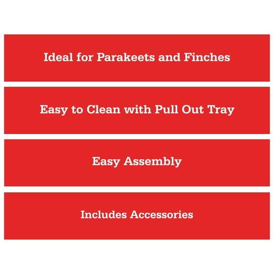 The Vibrant Life Small Bird Cage is designed for parakeets, finches and other small sized birds, with spacious space and enough ventilation to create a comfortable and healthy living environment for your birds. The pull-out tray makes cleaning easy and simple! No tools are required for assembly. The bird cage is constructed of metal and built in solid structure, with matching food bowl and natural wood perch to meet your bird's diet and claw sharpening needs. This Vibrant Life Small Bird Cage is ideal for the daily life of your beloved birds!