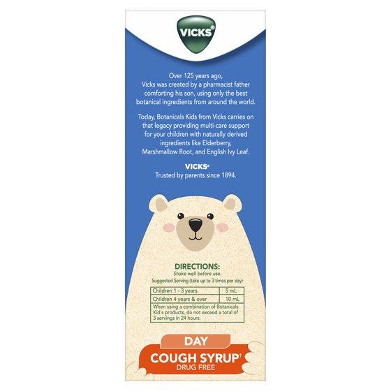 Vicks Botanicals Kids is a Drug-Free Cough Syrup, specially formulated for little ones ages 1+. Made with naturally-derived ingredients, Botanicals Kids 3-in-1 cough syrup contains marshmallow root to help soothe coughs*, ivy leaf to help clear mucus* and elderberry to soothe nasal irritation*. Created with a delicious berry flavor, this Botanicals Kids cough syrup is the answer to your little one's cough, day or night. It does not contain drugs, artificial dyes, high fructose corn syrup, honey or lactose and is gluten free. From the Makers of Vicks, trusted by parents for 130 years. Associated with hoarseness, dry throat and irritants. *These statements have not been evaluated by the Food and Drug Administration. This product is not intended to diagnose, treat, cure, or prevent any disease.