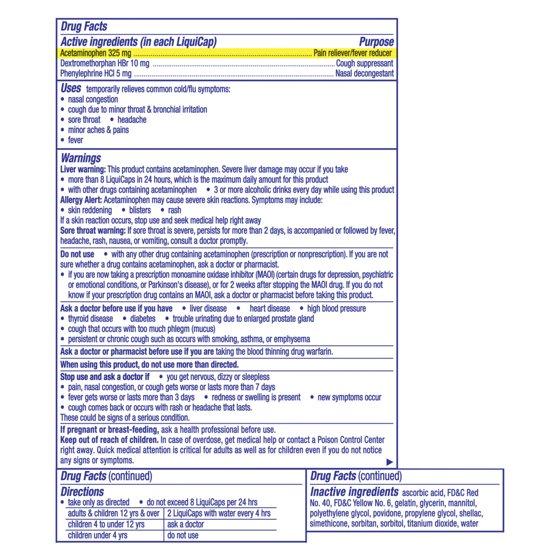 In Each LiquiCap: Active Ingredients: Acetaminophen (325 g), Pain Reliever/Fever Reducer; Dextromenthorphan HBr (10 mg), Cough Suppressant; Phenylephrine HCI (5 mg), Nasal Decongestant. Inactive Ingredients: Ascorbic Acid, FD&C Red No. 40, FD&C Yellow No. 6, Gelatin, Glycerin, Mannitol, Polyethylene Glycol, Povidone, Propylene Glycol, Shellac, Simethicone, Sorbitan, Sorbitol, Titanium Dioxide, Water.