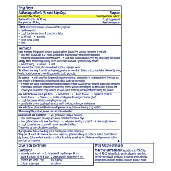 Active Ingredients (in each LiquiCap): Acetaminophen 325 mg (Pain reliever/fever reducer), Dextromethorphan HBr 10 mg (Cough suppressant), Phenylephrine HCl 5 mg (Nasal decongestant)Inactive Ingredients: FD&C Red No, 40, FD&C Yellow No, 6, Gelatin, Glycerin, Polyethylene Glycol, Povidone, Propylene Glycol, Purified Water, Sorbitol Sorbitan Solution, Titanium Dioxide