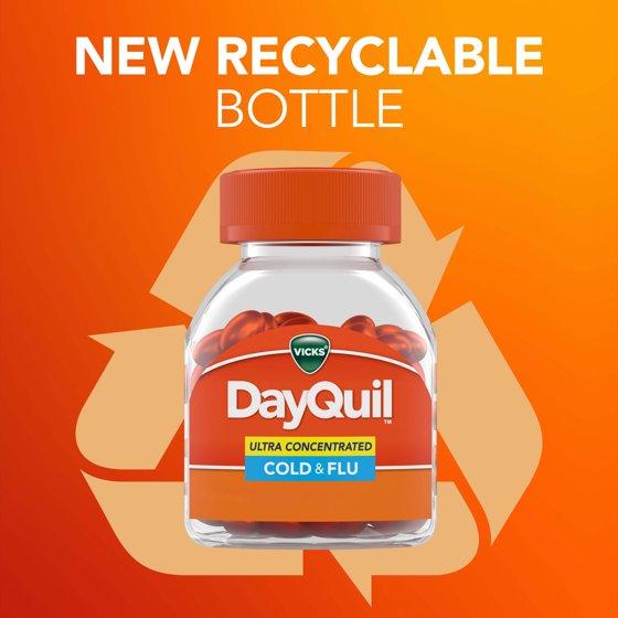 When cold and flu symptoms come on strong, knock them out with Vicks DayQuil Ultra Concentrated Cold and Flu LiquiCaps. Vicks DayQuil Ultra Concentrated Cold & Flu provides Max Strength, non-drowsy, daytime relief for your worst cold and flu symptoms. DayQuil relieves headache, fever, sore throat, minor aches & pains, nasal congestion, and cough. Contains acetaminophen. Now available in 25% smaller LiquiCaps compared to original DayQuil LiquiCaps. Now available in an easy to open bottle. Vicks has been trusted for over 125 years to relieve your cold and flu symptoms. When you need fast, powerful cold and flu relief, turn to Vicks DayQuil and Nyquil. DayQuil and NyQuil are the #1 pharmacist recommended daytime and nighttime cough, cold & flu brands. Use as directed. Keep out of reach of children. Compared to original DayQuil blister packs*Compared to Original DayQuil LiquiCaps 2022 Pharmacy Times Survey of Pharmacists OTC Recommendations