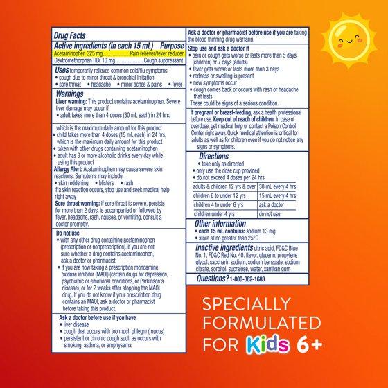 - SPECIALLY FORMULATED FOR AGES 6+, DAYTIME MULTI-SYMPTOM RELIEF from cough, sore throat, minor aches and pains, and fever