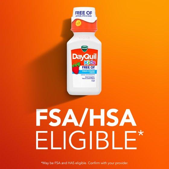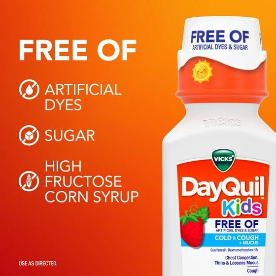 Vicks DayQuil Kids Free Of Cold & Cough multi-symptom relief liquid will treat your child's coughing & chest congestion and help thin & loosen mucus. It's formulated for children ages 6+ and designed for parents who want to give the best to their children, while avoiding artificial dyes and high fructose corn syrup. DayQuil Kids Free Of Cold & Cough over-the-counter medicine contains proven ingredients to tackle your child's cold and cough symptoms, and is free of artificial dyes, sugar, and high fructose corn syrup. Offering simple, effective relief, Vicks DayQuil Kids Free Of Cold & Cough Daytime Medicine relieves your child's symptoms so they, and the whole family, can go on with their day. It is specially formulated for kids with a great tasting berry flavor. Vicks has been trusted by parents to treat their children's cough, cold and flu symptoms for over 125 years.